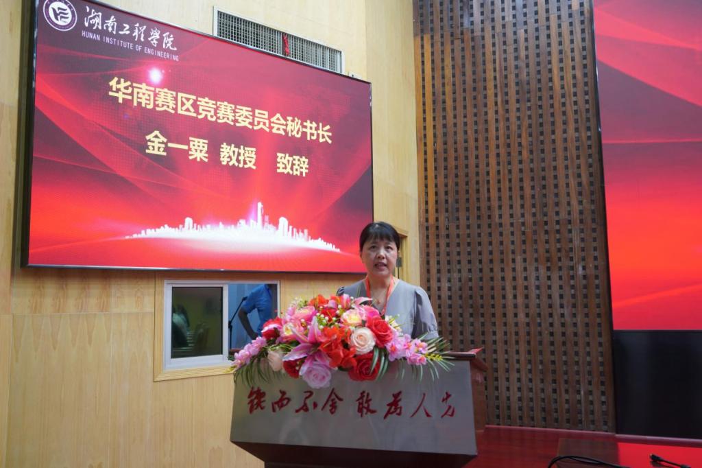 金一粟代表华南赛区竞赛组委会致辞。她简要介绍了本次竞赛的日程安排和相关事项,对我校承办此次决赛表示感谢,对参加决赛的来自华南赛区60所高校的59支队伍和1支国际赛道队伍共计60支队伍表示欢迎,并预祝所有参赛队伍赛出水平、赛出风采。