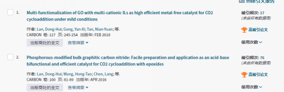 我院兰东辉博士在碳材料功能化方面的研究工作引起了同行专家的广泛关注,其在碳材料顶级期刊《Carbon》(SCI一区,IF=7.42)上发表论文4篇,其中2篇论文被遴选为ESI高被引论文(高被引论文是指在同年度同学科领域中被引频次排名位于全球前1%的论文)