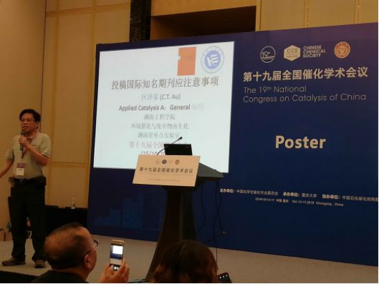 10月13-17日,由中国化学会催化委员会主办,重庆大学承办的第十九届全国催化学术会议在重庆召开。我院特聘教授区泽棠和兰东辉博士受邀参加了此次会议,区泽棠教授在专题研讨会上作了题为《投稿国际知名期刊应注意事项》的专题特邀报告并主持了分会场报告。