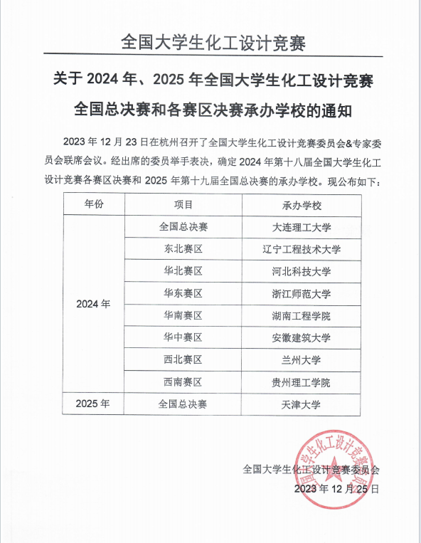 今日,全国大学生化工设计竞赛委员会发布《关于2024年、2025年全国大学生化工设计竞赛全国总决赛和各赛区决赛承办学校的通知》,通知中明确2023年12月23日在杭州召开的全国大学生化工设计竞赛委员会&专家委员会联席会议上,经出席的委员举手表决,确定由我校承办2024年第十八届全国大学生化工设计竞赛华南赛区赛。