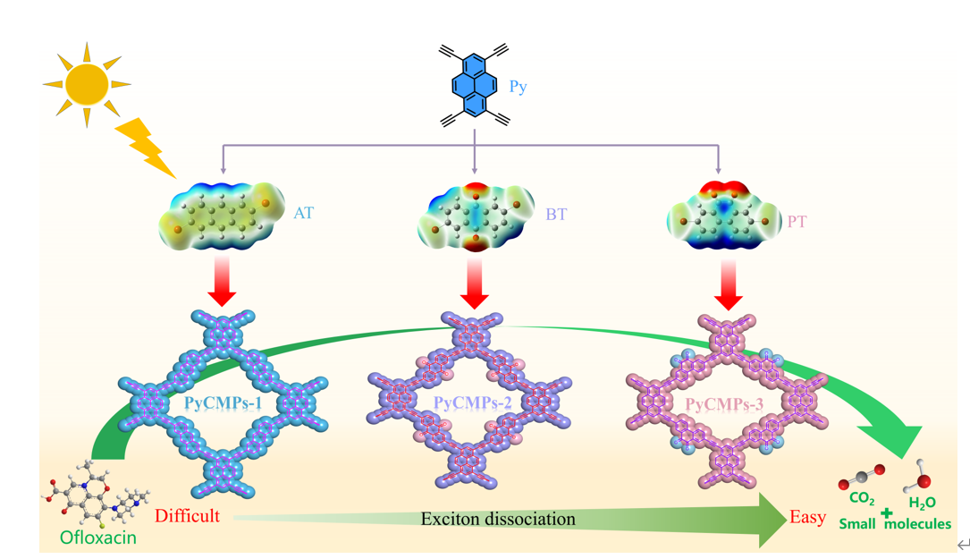 此外,在多孔材料降解有机污染物方面,该团队系统研究了受体中羰基位置的不同,对共轭微孔聚合物(CMPs)光催化活性的影响。研究发现,具有邻位羰基的CMPs具有最小的激子结合能,更容易发生激子分离,电荷分离效率最快。实验结果表明,该催化剂在降解抗生素方面表现出优异的降解效率,在环境催化和污染控制领域中具有潜在应用价值,对拓宽海泡石矿产资源的应用范围、以及有机多孔催化材料的设计提供了理论依据。研究成果以“Boosting Exciton Dissociation in Conjugated Microporous Polymers via Molecular Isomerization for Photocatalytic Degradation of Antibiotics”为题在国际知名期刊《Separation and Purification Technology》(SCI一区,IF=8.1)发表。我校材料与化工专业2022级研究生赵凯为论文第一作者,张伟杰博士和阳海教授分别为论文的通讯作者。