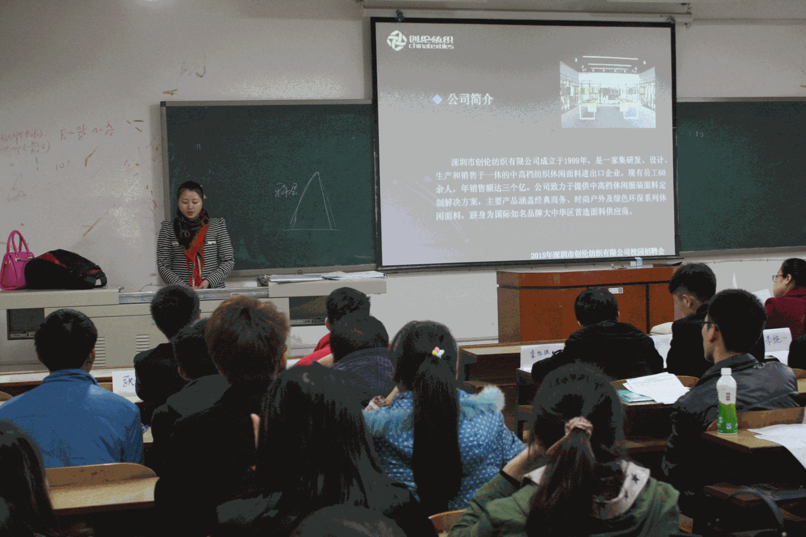 11月22日下午2点,深圳市创伦纺织有限公司来我校招聘,创伦公司人力资源部经理张芝兰前来做招聘宣讲,化工学院有意向的同学拿着自己简历前来应聘,现场秩序井然。