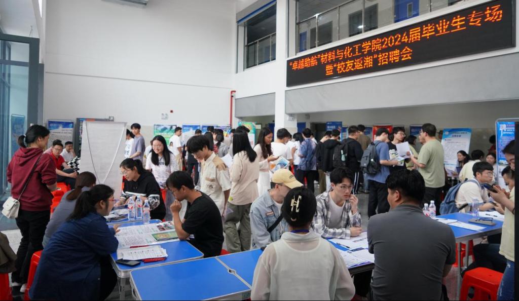 5月10日,我院“卓越助航”2024届毕业生专场暨“校友返湘”招聘会活动在材化楼大厅举行。来校招聘的校友企业佛山致兴纺织服装有限公司和广东创新精细工实业有限公司、湖南一格制药有限公司等25家用人单位,为学院毕业学子提供专业相关岗位100余个。