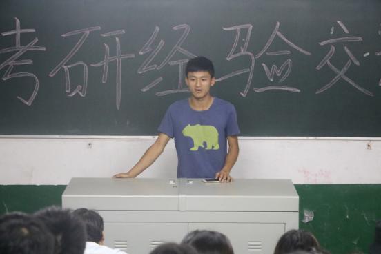 会议伊始,易苏向同学们简要分析了今年的考研情况:我院有91人报考,其中62人已确定被录取,考研上线率近70%。随后,龙晶上台发言,他从考研的意义、如何选择报考学校等方面结合自己的考研经验进行了精彩的讲解。他建议我们结合地理位置和工作几率等因素来选择报考学校。其中他详细地讲述了考研A区与B区的区别,两区按照经济发展程度和具体的地理位置来区分分数线,A区分数线高于B区。因此,我们在选择报考学校时应结合自身实际情况,切忌好高骛远。最后,他强调要想考出高分,学好英语是必需的,并就如何学好英语给了同学们一些建议。龙晶的详细讲解令同学们受益颇多。