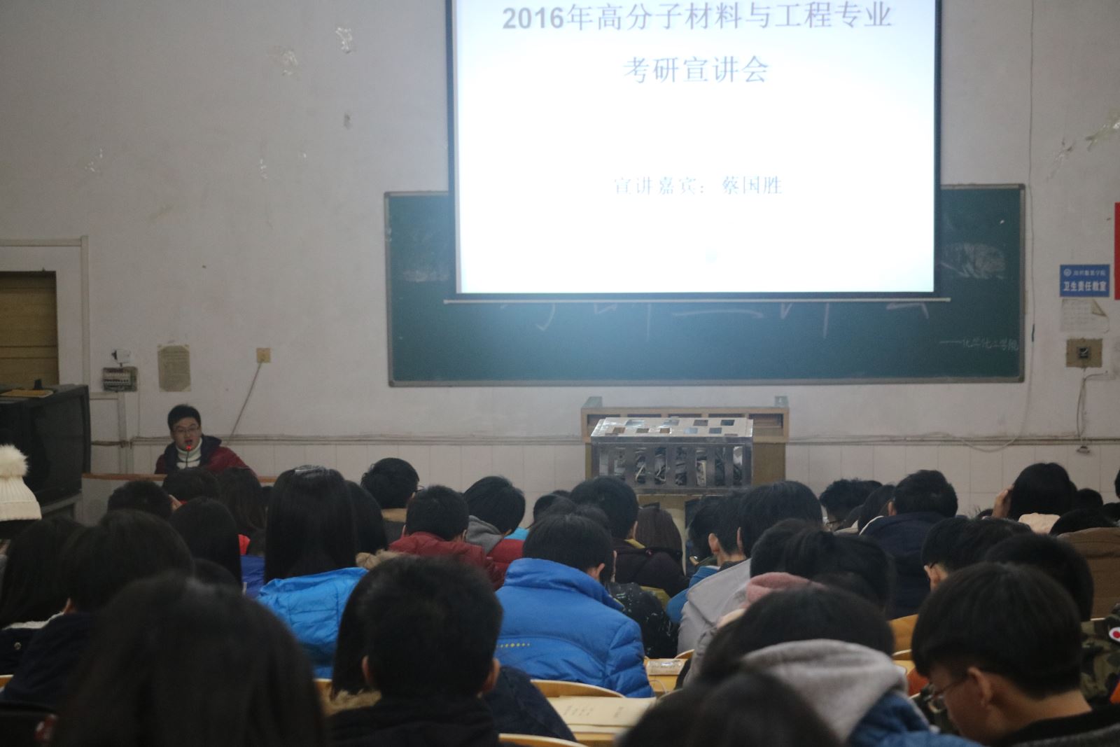 11月25日晚7点,我校于电教105组织高分子材料与工程专业的大一、大二、大三同学参加2016年高分子材料与工程专业考研宣讲会,此次宣讲会的主讲嘉宾蔡国胜,是我校12届高分子材料与工程的学生,现在湘潭大学读研究生。我院方正军博士也来到现场为同学们进行指导。