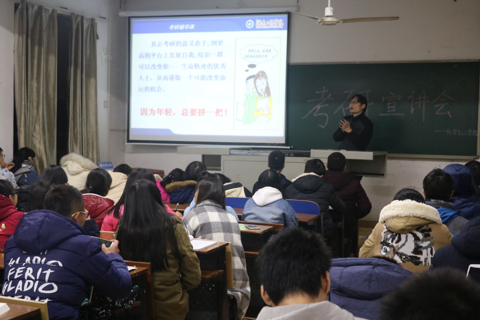 11月25日晚7点,化学化工学院应用化学专业在四教301举办考研宣讲会。本次宣讲会的主讲人为化学化工学院博士吴锋景。应用化学专业全体同学到场聆听。
