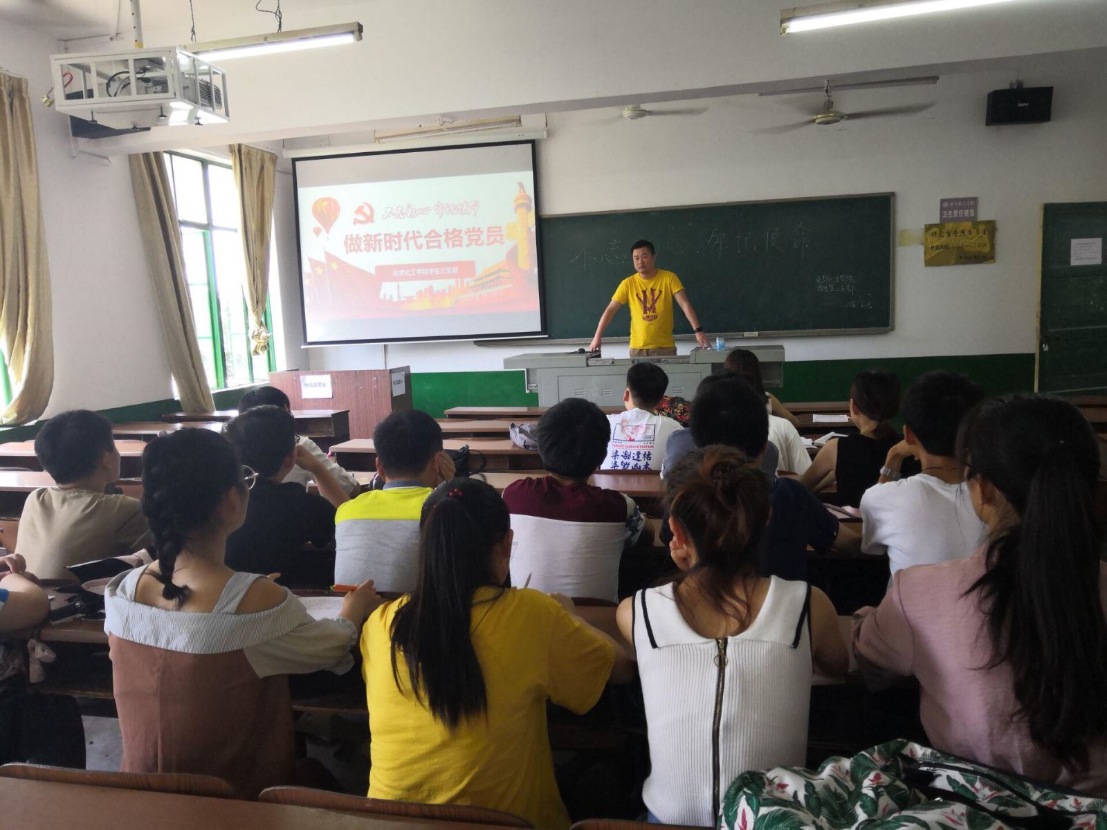 为进一步帮助支部学生党员深刻贯彻领会十九大精神,加强支部党员教育,2018年6月25日中午12点半,化学化工学院学生三支部于四教209开展了以“不忘初心、牢记使命” 为主题开展学习活动,让大家明确“初心”,坚定信念,牢记身上所肩负的使命,争做新时代的合格党员。党支部书记刘思博老师主持,学生三支部全体学生党员参加了本次学习会议。