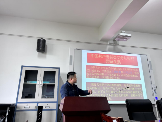廖云峰从党员的权利和义务着手,以党员的权利和义务的辩证关系、党员的八项权利、党员的八项义务、党员的八项、党员权利的总则说明四方面为中心进行阐释,叮嘱教工党员要不断提高自身素质和修养,更要结合自身的工作和岗位实际,正确履行党员义务和行使党员权利,做到遵守好党规党纪、校规校纪,在自己的教学和管理或服务岗位上凸显党员身份,敢于担当履职,尽心尽责,发挥好先锋模范作用,争当合格党员。