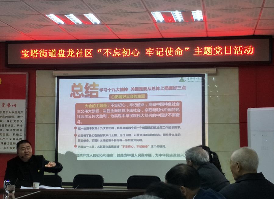 3月27日上午9点半,盘龙社区特邀区科协主席周雪阳召开了以“不忘初心、牢记使命”为主题的十九大宣讲党日活动,参与本次会议的有盘龙社区一、二支部党员以及湖南工程学院爱心社的6名入党积极分子。