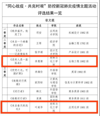 7月16日,湖南工程学院“同心战疫·共克时艰防控新冠肺炎疫情主题文艺作品创作大赛”比赛结果出炉,此次大赛面向全体学生征集抗击疫情的文学、书画、摄影类文艺作品,致敬所有抗疫期间奋斗在一线的医护人员,激发战“疫”正能量。经过评选,我院生物工程1802班李慧情获征文组二等奖,应用化学1801班叶美华获征文组三等奖,化学工程与工艺1901班梁佐泳获海报组三等奖。