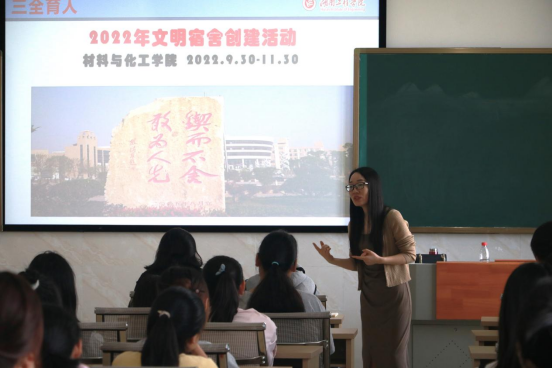 为有效推进文明寝室创建,营造良好的宿舍生活环境,10月25日中午,beats365唯一官方网站在新化工楼602教室开展2022年文明寝室创建活动暨文明礼仪知识讲座,活动由学院辅导员李娥君主持,2020-2022级全体寝室长参加。