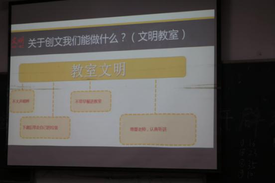 班会伊始,主持人就如何创建文明校园环境、维持生活学习环境卫生等方面进行讲解,并提到创建文明校园环境不只避免行动垃圾,还要杜绝思想上的垃圾,做到由内至外的“创文创卫”。随后,主持人又例举了发生在大家身边的如:带早餐进教室、垃圾随处乱丢等普遍存在的不文明行为,希望大家杜绝此类事件的再次发生。同时,也提醒同学们在平日里注意自己的言行举止,不要开口成“脏”,彻底告别思想垃圾。