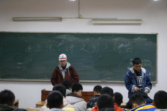 为进一步加强我校学生思想道德建设,净化校园环境,建设文明校园。11月19日,化学化工学院组织大一大二各班于红楼开展了以“讲文明、树新风、创美丽新校园”为主题、以“告别行动垃圾、思想垃圾”为主旨的班会活动。