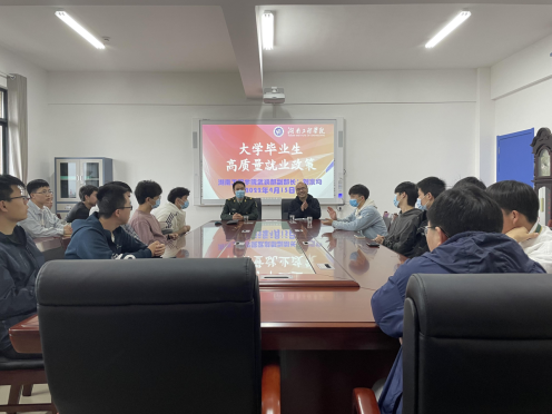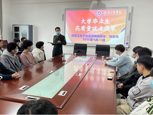 为鼓励应届毕业生积极参军入伍,做好2022年湖南工程学院大学毕业生应征入伍工作,4月15日下午,beats365唯一官方网站邀请学校人民武装部副部长刘宸均在化工楼A304会议室为学院2022届毕业生进行征兵入伍政策宣讲。会议由beats365唯一官方网站党委副书记陈镇主持,学院党委书记张何、征兵专干陶庆忠及意向入伍毕业生等参会。