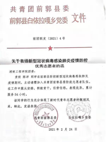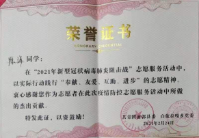 国有难,君子当舍身报国;国将兴,君子当舍身不辍。2021年1月下旬,受吉林省新型冠状病毒超级传播链影响,轻化工程1701班大四陈洋同学所在的家乡松原市前郭县爆发疫情。自1月20日起,他成为前郭县委防疫志愿者队伍中的一员,奔赴松原市白依拉嘎乡韩家店村抗疫前线,从最初的走访每家每户,向村民宣传抗疫相关知识,到后来为村民登记相关信息,在乡村卡点站岗,以及最后阶段在核酸检测现场维持秩序,组织相关人员有条不紊开展工作。“作为当代大学生的我们,当国家、民族有难时,我们理应走在人民的前列,为国家贡献力量。虽然每项工作都很累很繁琐,但当我看到我服务的村屯未受疫情威胁的时候,我就特别骄傲,充满干劲。愿我们携手与共,共克时艰。愿祖国早日走出困境,国泰民安。”