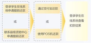 ⑴可以到县级资助中心或登录学生在线服务系统申请一次性还清一份或多份《借款合同》尚未清偿的所有助学贷款本金及相应利息;也可以申请提前偿还部分本金(必须为人民币500元以上、且为100元的整数倍数的金额)及相应利息。申请后需尽快前往就近的县级资助中心或高校资助中心使用助学贷款专用POS机刷借记卡还款或在支付宝账户内充值还款。