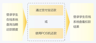 ⑴11月1日(最后一年为9月1日)以后,登录学生在线服务系统www.csls.cdb.com.cn,查询还款当期还款额度。系统用户名为借款学生身份证号,如果密码遗忘可拨打95593重置。