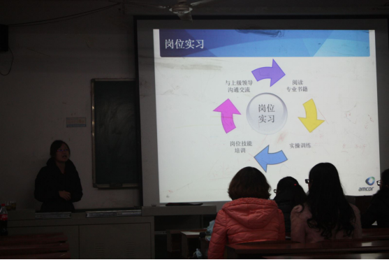 招聘员李鑫以一个生活用品安全的视频引出话题,指出公司能给员工提供安全舒适的工作环境,完善的医疗保障,强调员工的工作安全是公司重点关注问题之一。为了进一步加深同学们对公司的了解,李鑫就安姆科已成为食品、药品、化妆品等领域的领先包装商展开演说,结合ppt向同学们介绍了公司的发展概况、优厚的薪酬待遇、人才的培养计划、灵活的管理以及招聘专业和招聘岗位人数。在人才培养计划中,李鑫对于公司的特色培训课程“我是特种兵”进行了强调。