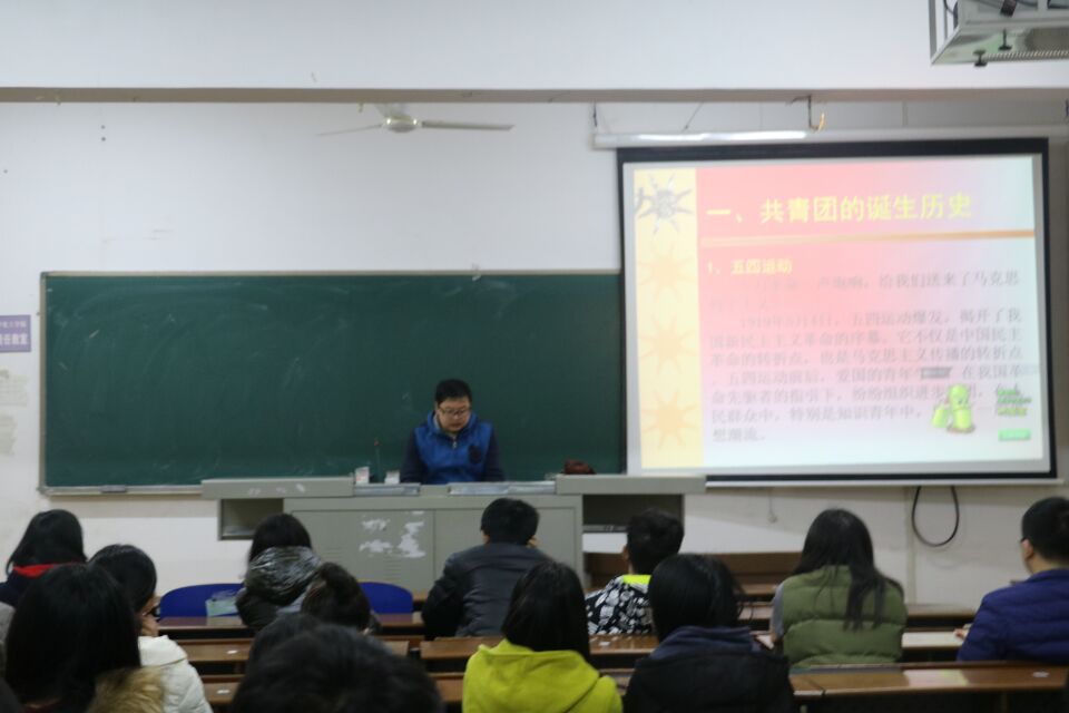 会议伊始,易苏首先向同学们介绍了要做合格团员,首先就要了解共青团的诞生历史,并详细介绍了民主革命、社会主义时期到改革开放和现代化建设这三个不同时期的的共青团。随后,易苏又结合习近平总书记的重要讲话精神,向同学们解释了习近平总书记对广大青年同志的希冀,最后,易苏以习近平总书记的重要讲话为出发点先同学们强调了入团的必要性:共青团是中国共产党领导的先进青年群众组织,是广大青年在实践中学习共产主义的学校,是中国共产党的助手和后备军。要想加入中国共产党,为祖国多做贡献,入团是前提。本次的会议重点是让同学们更加清楚地了解团员义务,提高自身素质,在群众中发挥模范作用,如鼓积极参加各项活动,热心帮助他人等力所能及的小事。