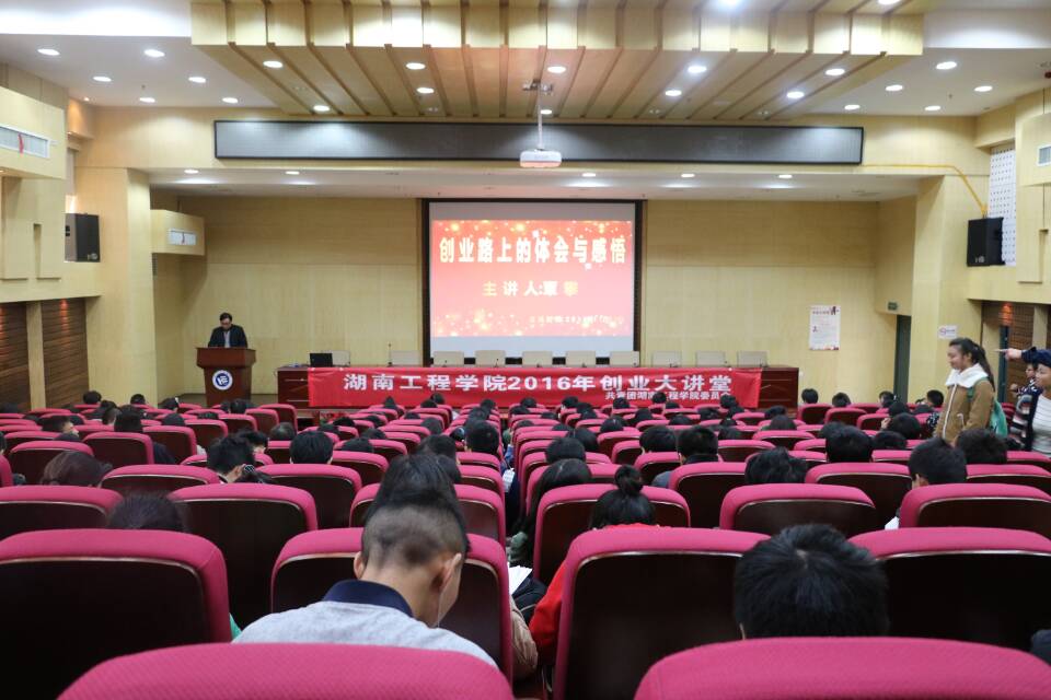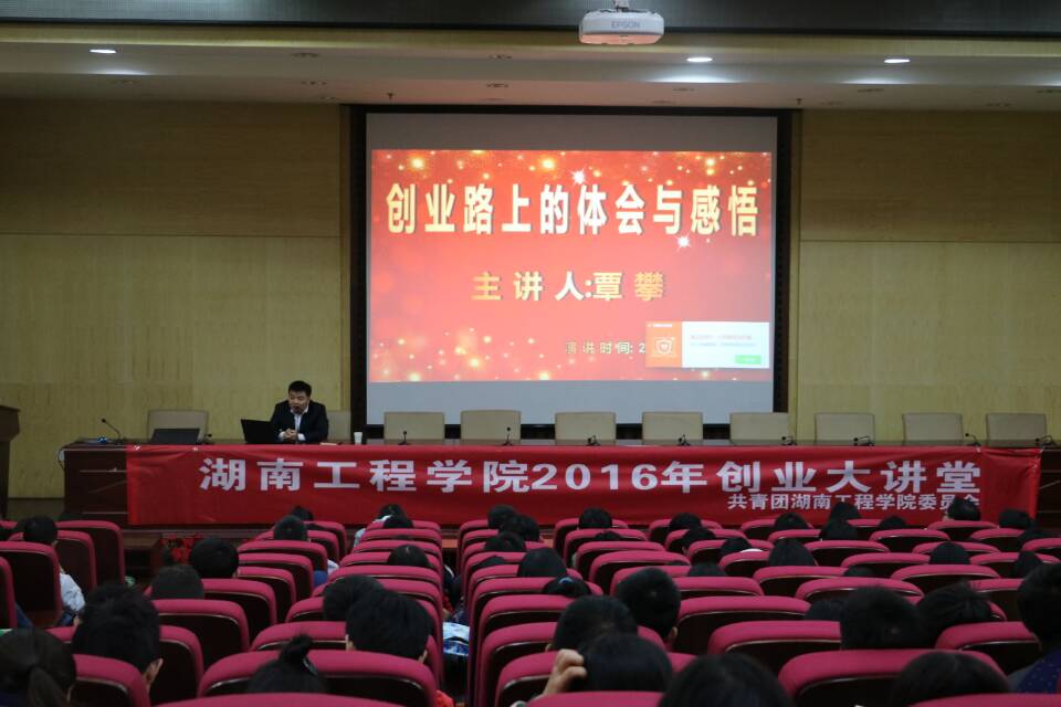 11月11日下午3点,由湖南工程学院校团委主办,化学化工学院承办的“创业大讲堂”专题讲座于图书馆一报告厅成功举办,我院特地邀请了在创业路上有所建树的学长覃攀来为我院学生做了精彩的演讲,另外出席本次讲座的还有化学化工学院副院长张何、学办主任吴菲以及我校学生,讲座由张何主持。
