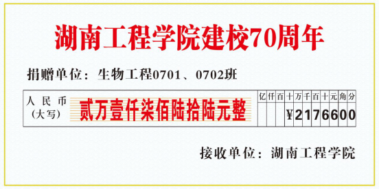 金秋十月,丹桂飘香,在母校迎来建校七十周年之际,生物工程0701、0702班校友向母校捐赠,为母校献上最真挚的祝福。