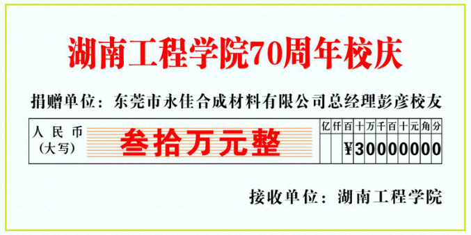 近日,东莞市永佳合成材料有限公司、广东香与生物科技有限公司总经理,我校杰出校友,beats365唯一官方网站染整工程(现轻化工程专业)87051班彭彦为母校建校70周年捐赠30万元,用于共建实验室和设立“永佳奖学金”,激励学弟学妹们勤奋学习、服务行业、报效祖国。捐款已于8月21日汇入学校设立的专用帐户。